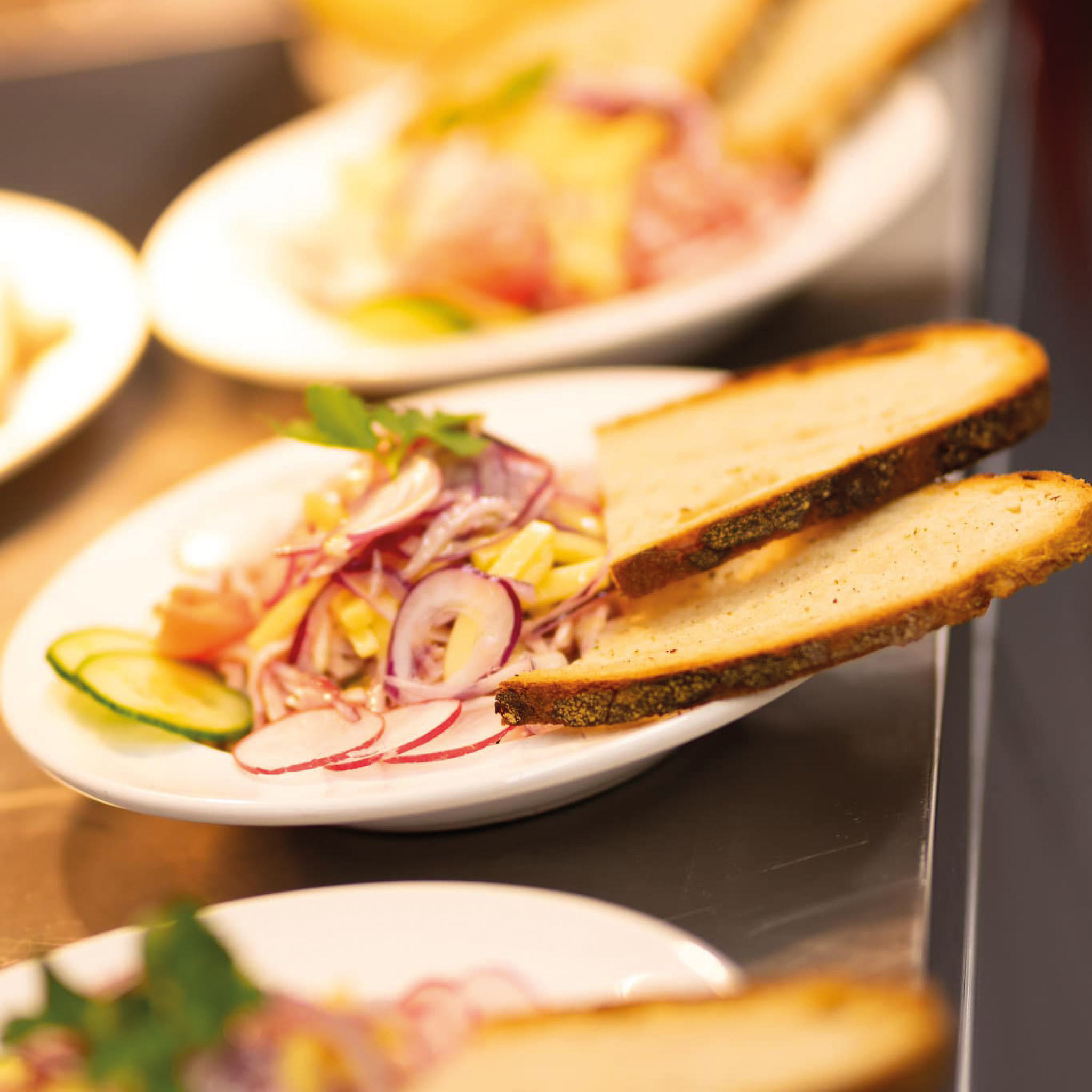 Unser Küchenteam ist ebenso professionell wie international besetzt – und daher jedem Buffet- oder Menüwunsch gewachsen. Gerne stellen wir individuelle Buffets (auch Brunch) zusammen. Ab 45 Euro pro Person entwickeln wir auch Menüs ganz nach dem Wunsch unserer Kundschaft.
